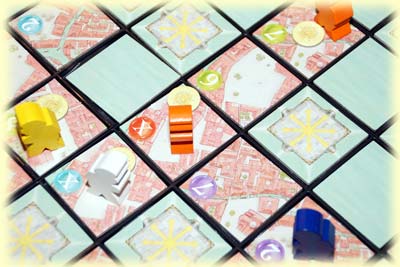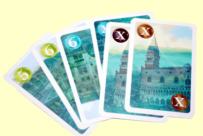 Auch auf die Wertung der Kunstschätze wirken sich übriggebliebene Stadtteile aus. Je weniger Stadtteile einer Farbe am Ende noch im Spiel sind, umso wertvoller, weil seltener sind deren Schätze. Versinken etwa von den roten Stadtteilen alle bis auf den 2er-Stadtteil, ist jedes rote Schatzplättchen stolze 6 Punkte wert. Bleiben 2 Stadtplättchen übrig, sind es immerhin noch 3 Punkte je Schatz. Bei mehr als 3 Stadtplättchen lohnt sich ein Erwerb nicht mehr, denn deren Schätze zählen nur mehr 1 Punkt, genauso viel wie man am Ende für jede verbliebene Münze bekommt.