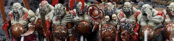 Miniaturen:Die Miniaturen sind wieder einmal auf dem extrem hohen Standard von Games Workshop erstellt worden. Bewaffnungen, Rüstungen, Standarten und was sonst noch so alles auf dem Schlachtfeld anfällt, wurden detailliert ausgearbeitet. Einzig das Aussehen der Modelle wird für Diskussionsstoff sorgen. Die neuen Modelle heben sich stark von Ihren Vorgängermodellen ab und erinnern ein wenig an mongolische Sumoringer. Aber Aussehen ist nun mal Geschmackssache. Erhältlich sind die Modelle sowohl im praktischen und vielseitigen Plastikrahmen, als auch in Metallgussform.