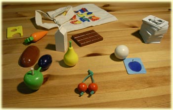 Das Spiel beinhaltet 10 relativ bekannte Lebensmittel: Apfel, Birne, Brot, Ei, Karotte, Käse, Kirschen, Milchtüte, Pflaume, Schokolade. Mit diesen robusten Holzteilen sowie denn dazu passenden Bildern auf Karten und einer Einkaufstasche bietet die Spielregel vier verschiedene Spielmöglichkeiten.