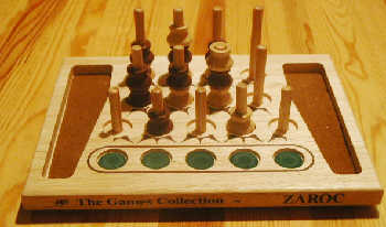 Was das Material betrifft, ist bei Pin Int. generell nichts auszusetzen. Das Holzmaterial ist hochwertig und es macht Spaß mit diesem Material zu spielen. Es gibt jedoch unterschiedliche Spielfeldgrößen. Während Fire & Ice und City Scape über große Holzspielfelder verfügten, sind die Spiele der Game-Collection (hir Collection Nr. 2) eine Nummer kleiner gestaltet. Für das Spiel ist dies nicht von Nachteil und für den Preis sicher auch nicht. Einzig nachteilig bei Zaroc sind die Holzstäbchen, welche aus dem Spiel gezogen werden müssen, wenn man das Spiel zurück in die Schachtel verstauen möchte. Wer die kleine Pintoy-Serie sammelt, hat jedoch die Möglichkeit einen Spiel-Ständer zu erwerben, in den jeweils 4 der Spiele hineinpassen. Dies ist nicht nur praktisch, sondern macht auch optisch etwas her.