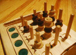 Das Spielbrett besteht aus 5 x 4 Feldern, welche sich in 4 Reihen mit jeweils 5 Feldern aufteilen. In den ersten drei Reihen ist jedes Feld mit einem Holzstab versehen, auf welche die Spielsteine gestülpt und damit gestapelt werden können. Die maximale Bauhöhe wird in Richtung der Zielfelder kleiner.
