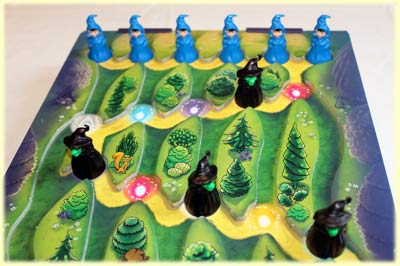 Der Zauberberg wird hier durch eine schiefe Ebene dargestellt. Die blauen Zauberlehrling-Figuren starten ganz oben und bewegen sich im Laufe des Spiels auf einem gelb markierten Weg talwärts. Für die schwarzen Hexen-Figuren gibt es vorgesehene Startpositionen entlang dieses Weges. Der Spielplan weist aber auch noch Einkerbungen auf. Dies sind die Bahnen, auf denen die Irrlichter - farbige Kugeln - nach unten rollen. Die Kugeln kommen zu Beginn in einen Beutel.