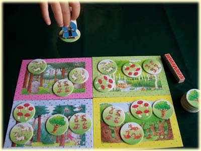 Die vier Zauberwaldkarten werden in die Tischmitte gelegt und darauf je vier Plättchen platziert. Wer an der Reihe ist, wirft den Zauberwürfelstab. Dann nimmt er den magnetischen Zauberlehrling zur Hand und darf ihn auf ein Plättchen jener Zauberwaldkarte, dessen Farbe der Stab zeigt, stellen.