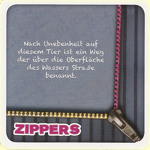 "Zippers" sind "Reißverschlüsse" – ein gut gewählter Titel für dieses Spiel, denn es wurden zwei Sätze zusammengefügt, die es wieder in ihre ursprüngliche Form zu trennen gilt. Am Ende soll man aber nicht die beiden Sätze getrennt aufsagen können, sondern als Erster die zwei Wörter herausfinden, die diese Sätze beschreiben. Spieltechnisch läuft das so ab, dass ein Spieler den Kartentext vorliest (meistens öfter als einmal) und die anderen raten. Den Rateversuch für eines der beiden Wörter meldet man mit Handschlag auf die Antwortkarte an. Er kostet immer einen Chip. Davon besitzt man anfangs 10 und muss jeweils zu Rundenbeginn - sozusagen als Startgeld - einen in den allgemeinen Pott legen. Hat man richtig geraten – wobei es auch genügt, ein Wort herauszufinden – erhält man die Hälfte der Chips aus dem Pott. Ansonsten geht man leer aus und darf nur mehr einen Rateversuch für den zweiten Begriff starten. Nach acht Runden gewinnt der Spieler mit den meisten Chips. Vorzeitig kann das Spiel auch enden, wenn jemand sein Startgeld nicht mehr bezahlen kann.