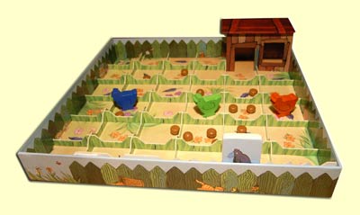 Öffnet man die Schachtel, hat man sogleich den Spielplan vor sich, der im Schachtelboden integriert ist. Nun muss man nur noch schnell die Hühner auf das Dach des Stalles setzen, an jeden Spieler 10 Körner verteilen, den Raben auf die erste Zaunlatte setzen und schon kann es losgehen.