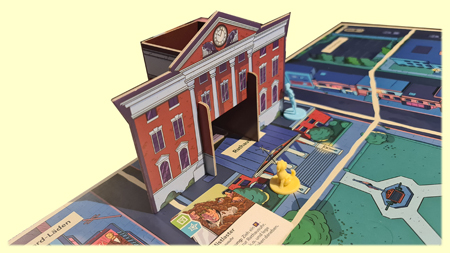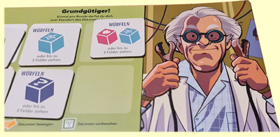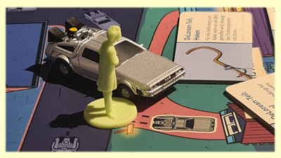 Material: Der Spielplan, das 3-dimensionale Rathaus, der Miniatur-DeLorean, die einzelnen Figuren und die Charakter-Tableaus haben einen hohen Aufforderungscharakter. Die Tableaus sind zwar sehr dünn und waren bei uns zu Beginn etwas wellig, das legte sich aber nach den ersten zwei Partien. Das 3D-Rathaus soll eigentlich ein Würfelturm sein, aber das ist eher unpraktisch. Wir haben ihn nur als optisches Gimmick genutzt. Die bunten Challenge-Würfel sind individuelle Würfel für dieses Spiel und kein Standard. Die Chance- und Ärger-Karten sind im Comic-Style gehalten und schmiegen sich thematisch sehr passend in die Geschichte ein. Die Optik macht Zurück in die Zukunft zu einem sehr atmosphärischen Spiel. Hier wirkt nichts aufgesetzt.