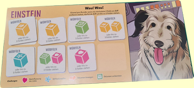 Nun folgt der Spielzug eines Spielers: Jeder Spieler hat für seinen Charakter ein Tableau mit Aktionsplättchen darauf. Diese können entweder zum Bewegen auf dem Spielplan oder zum Bewältigen von sogenannten Challenges genutzt werden. Challenges sind Würfelproben. Hierzu gibt es unterschiedliche Würfelfarben: